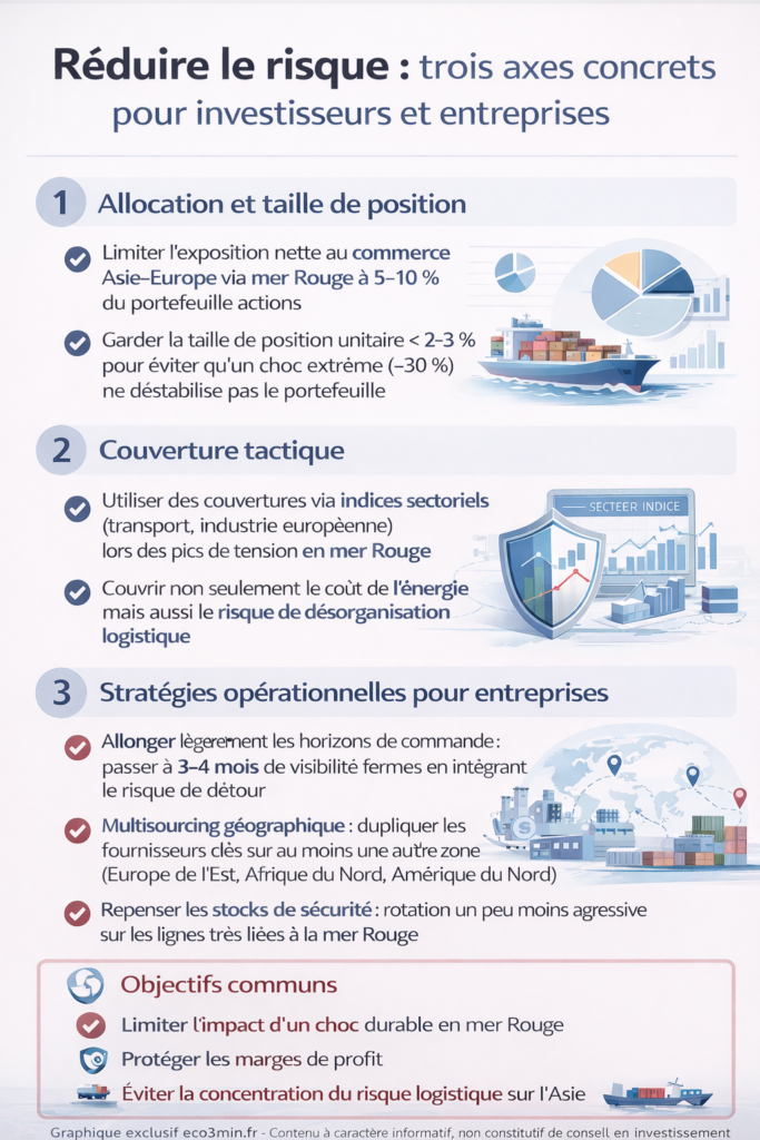 Au sein d’un portefeuille diversifié, une discipline prudente consiste à contenir l’exposition aux valeurs directement tributaires du commerce Asie–Europe via la mer Rouge (compagnies maritimes, industriels européens à fort contenu asiatique) dans une fourchette de 5 à 10 % de la poche actions, selon l’appétit pour le risque. À l’intérieur de ce compartiment, plafonner chaque ligne à 2–3 % permet d’absorber un scénario adverse sévère (–30 % sur un titre) sans compromettre la performance globale.