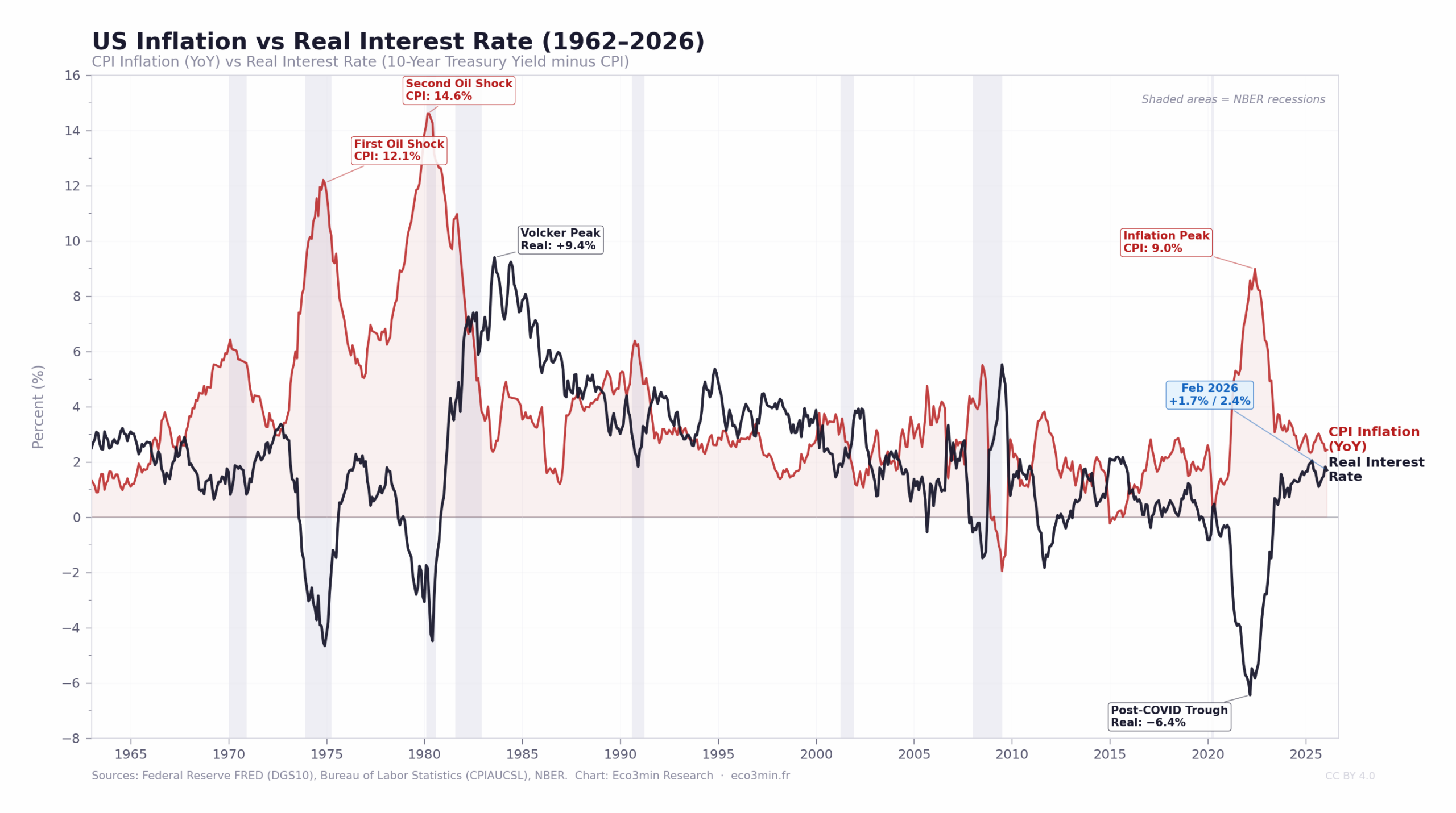Sources: Federal Reserve Bank of St. Louis (FRED, series DGS10), Bureau of Labor Statistics (CPIAUCSL), NBER recession dates. Chart: Eco3min Research.